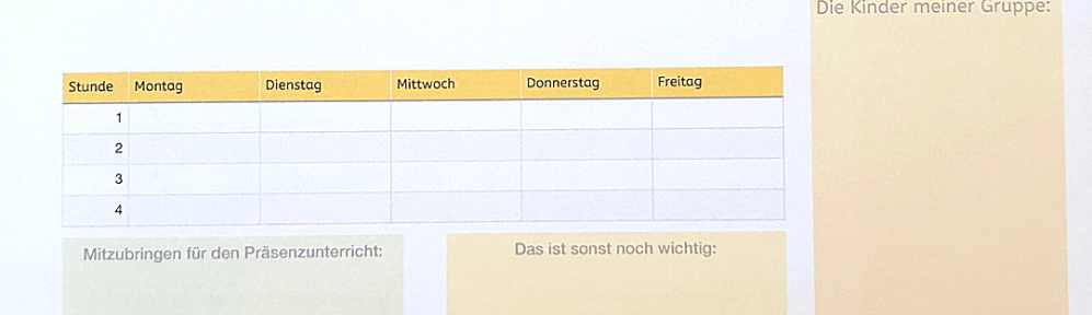 Ich erstelle für jede Gruppe einen Wochenplan im voraus: Darin ist alles vermerkt. Wer wann im Präsenzunterricht ist, wann im Distanzlernen. Wer wann welches Unterrichtsfach hat – denn wir Kolleg*innen haben auch an der einen oder anderen Stelle miteinander mal Stunden getauscht.