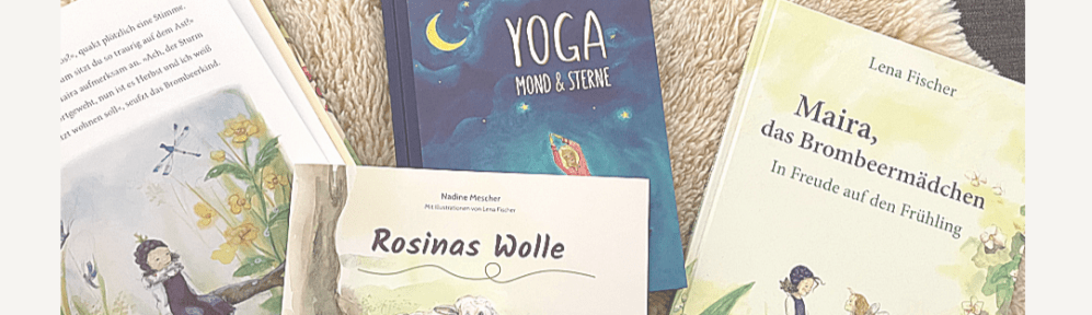 Außerdem „Rosinas Wolle“ von Nadine Mescher (mein Buch), „Yoga, Mond & Sterne“ von Daniela Heidtmann und „Maira, das Brombeermädchen“ von Lena Fischer, Asteya Verlag.