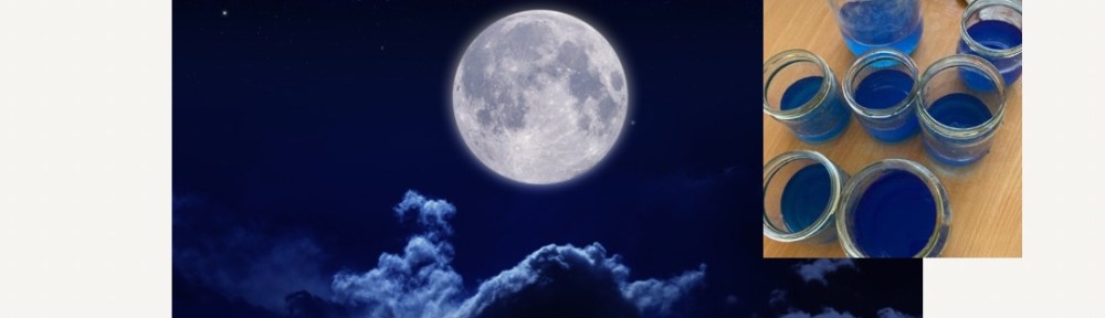Ich habe zur Vorbereitung in einen Eimer mit Wasser etwas blaue Aquarellfarbe gegeben (die blaue Farbe zeigt sich den Kindern deutlicher als klares Wasser) und das Gemisch auf Einmachgläser verteilt – die Nordsee im Glas. Jedes Team bekam ein Glas. Das Kind, das die Erde darstellte, hielt sozusagen die Nordsee in Händen. Während es sich langsam um die eigene Achse drehte, musste das Glas ein wenig in Richtung Mond (Anziehungskraft) gekippt werden – wie vom Mond angezogen – , vom Mond abgewandt wiederum zur anderen Seite. Das Kind, welches also Erde mit Nordsee darstellte, musste bei der eigenen Drehbewegung auf den Standort des „Mondkindes“ achten. Dieses wiederum konnte die Bewegung des blauen Wassers gut beobachten.