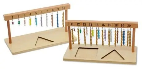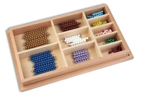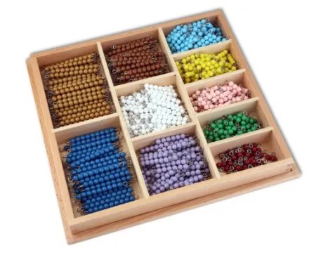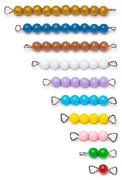 Beim Montessori-Kettenmaterial gibt es im Zahlenraum bis 10 Perlenverbindungen zum Kombinieren. So kann man die Zahl 44 als 44er Kette gestalten: Vier 10er plus ein 4er. Dieses Perlenmaterial hilft ganz besonders beim Erlernen der ersten Multiplikation. So lässt sich wieder be-greifen, wie 3 x 4 eine fortgesetzte Addition ist: 3 mal eine 4-er Kette. Auch die Umkehrung 4 x 3, bei der die gleiche Menge Perlen benötigt wird, lässt sich so sehr anschaulich darstellen. So können die Kinder die Einmaleins-Aufgaben legen und das Ergebnis auch selbst überprüfen.