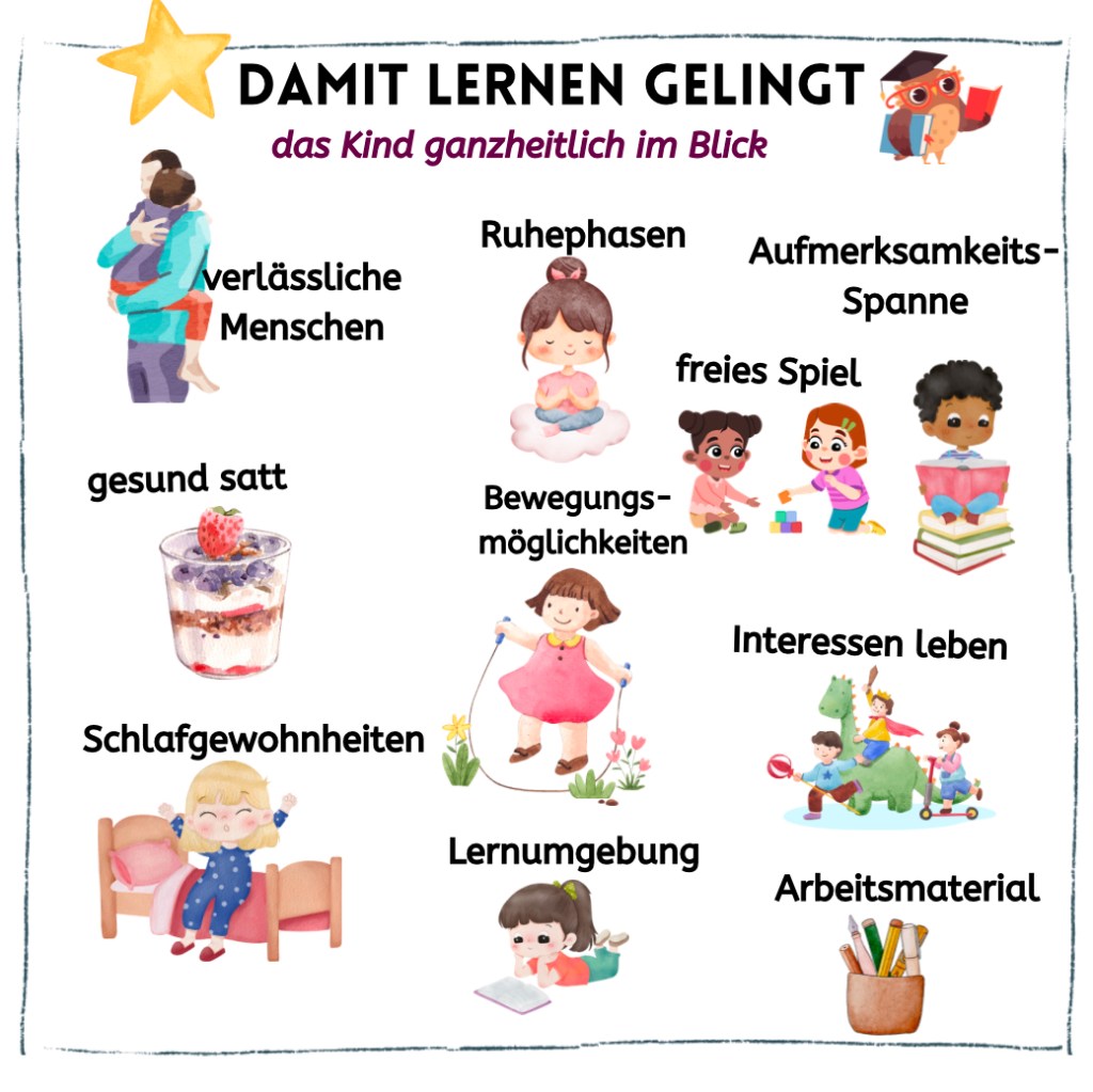 Ich war mal kreativ und habe dieses Schaubild erstellt. Wenn all diese Dinge und Themen in einer guten Balance sind, gelingt das Lernen im wahrsten Sinne spielend.