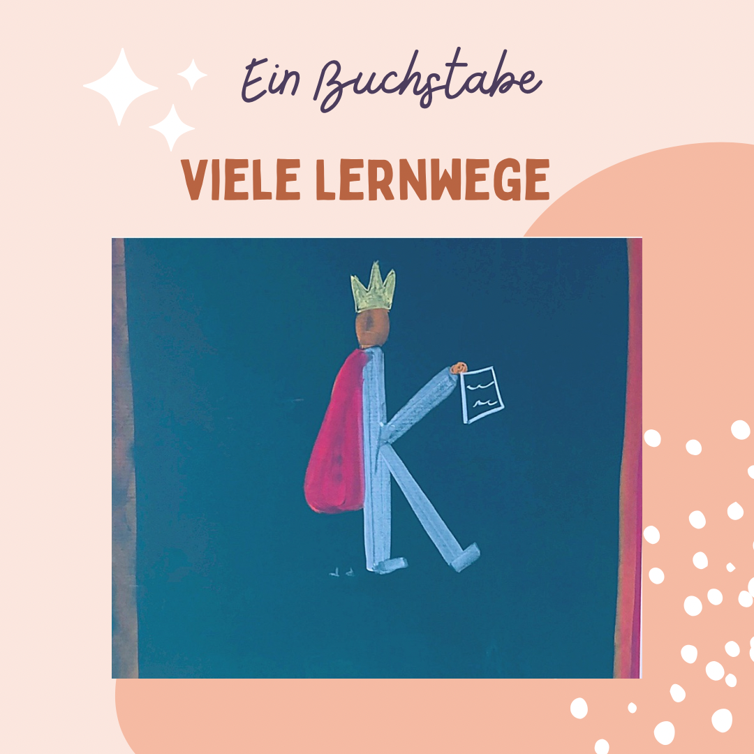 Am nächsten Tag wird die Geschichte mit eigenen Worten wiederholt, die Verschen gesprochen und aus dem Anfangsbild der Buchstabe herausgearbeitet. „Wer hat uns das K gebracht?“ – „Der König!“ Die Kinder üben nun die Schreibweise des Buchstabens auf dem Sandtablett, kneten ihn, legen ihn ganz groß mit Seilchen in den Sitzkreis, balancieren dann darüber usw. Auch werden weitere Wörter gesucht, die mit diesem Buchstaben beginnen, ihn enthalten oder auf ihn enden. Laut und Bild werden auf vielfache Weise erlebt. Der Buchstabe wird anschließend groß ins Heft gemalt.