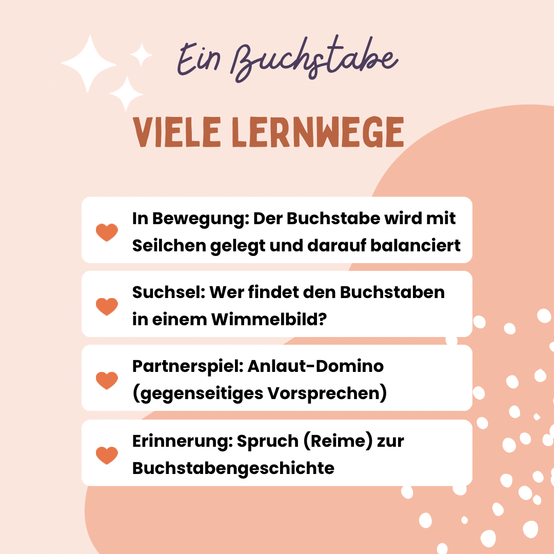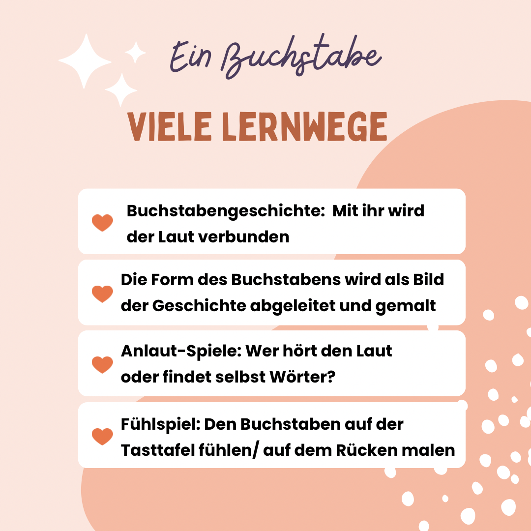 Buchstaben sind abstrakt, ihr Aussehen wurde irgendwann festgelegt und einem Laut zugeordnet. Um Lesen und Schreiben zu erlernen, müssen immer wieder einzelne Laute der Sprache herausgehört und mit der Darstellung von Buchstaben verknüpft werden. Andersherum schließt das „Aussehen“ von Buchstaben auch auf einen Laut.