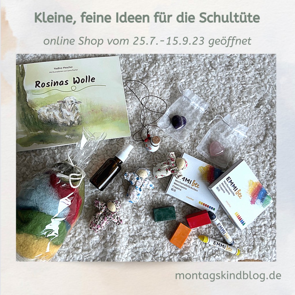 Während im Süden Deutschlands die Sommerferien endlich vor der Tür stehen, blickt Nordrhein-Westfalen schon auf das neue Schuljahr. Ich öffne daher meinen kleinen Shop wieder vom 25.7. – 10.9.23 mit einer kleinen, feinen Auswahl für die Schultüte. Der Verkauf gilt, solang der Vorrat reicht (abgesehen von Rosinas Wolle – die ist immer da).