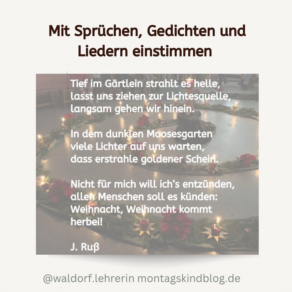 Ich werde in den nächsten Tagen passende Sprüche, Lieder und Gedichte teilen. Man kann sie gut in einem ruhigen Moment lesen, hören und wirken lassen.