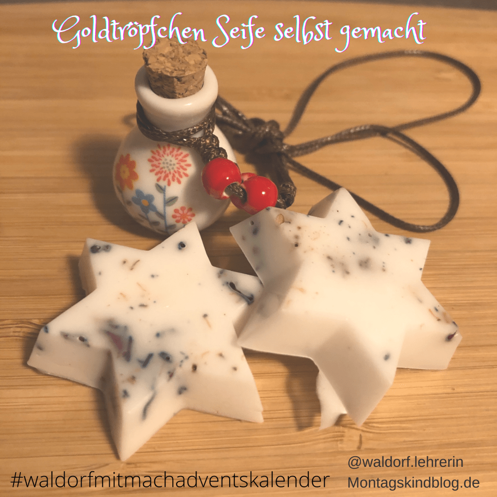 Meine Klasse mag ihr Goldtröpfchen-Öl. Daher habe ich mir für den Klassenkalender überlegt, dass die Kinder in diesem Jahr von mir eine selbstgemachte Goldtröpfchen-Seife von mir bekommen. Heißt: Die Mischung der ätherischen Öle, die auch in dem Pflegeöl enthalten ist, kommt diesmal in eine Seifenbasis.