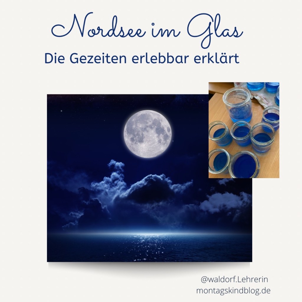 Ich habe zur Vorbereitung in einen Eimer mit Wasser etwas blaue Aquarellfarbe gegeben (die blaue Farbe zeigt sich den Kindern deutlicher als klares Wasser) und das Gemisch auf Einmachgläser verteilt – die Nordsee im Glas. Jedes Team bekam ein Glas. Das Kind, das die Erde darstellte, hielt sozusagen die Nordsee in Händen. Während es sich langsam um die eigene Achse drehte, musste das Glas ein wenig in Richtung Mond (Anziehungskraft) gekippt werden – wie vom Mond angezogen – , vom Mond abgewandt wiederum zur anderen Seite. Das Kind, welches also Erde mit Nordsee darstellte, musste bei der eigenen Drehbewegung auf den Standort des „Mondkindes“ achten. Dieses wiederum konnte die Bewegung des blauen Wassers gut beobachten.