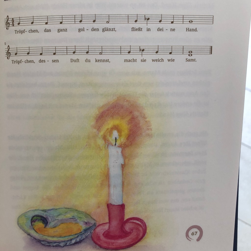 Ein schönes Goldtröpfchenlied, das für die Altersspanne 3 – 8 hervorragend passt, ist auch in dem Buch von meiner Schwester „Yoga, Mond & Sterne“ zu finden (eigene Werbung). Sie beschreibt auch ein passendes Kindermassageritual mit dem Goldtröpfchenöl sehr schön.